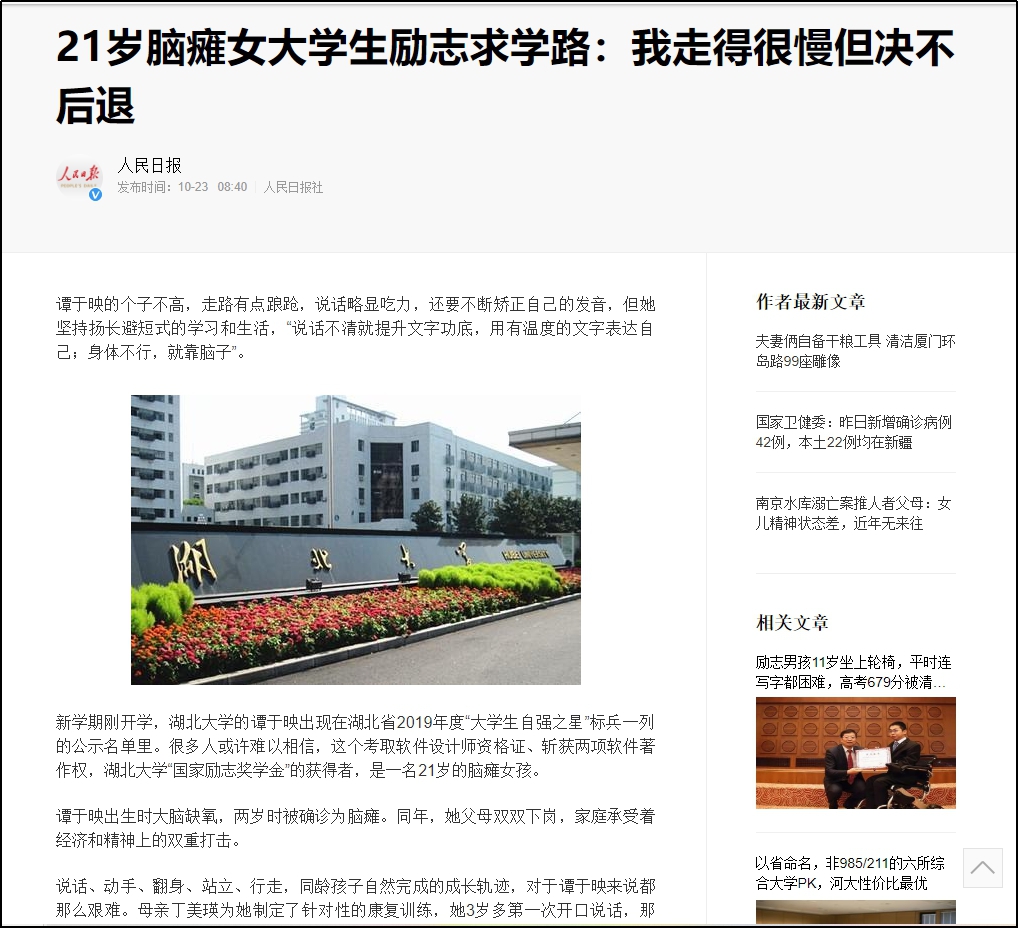谭于映乐观坚强的求学事迹近期被各大媒体关注,9月10日,《楚天都市报》以《15年坚强求学不言放弃  节假日去养老院做义工  脑瘫大学生投身公益回馈社会》为题,大篇幅报道报道谭于映坚强求学、热心公益的自强事迹。随后,9月14日,《太阳集团古天乐校报》第1205期第3版“校园新闻”以《十五年坚强求学不言放弃节假日去养老院做义工  励志大学生投身公益回馈社会》为题,“太阳集团古天乐”官方微信公众号以《她是谭于映,不一样的谭于映!》,分别整版报道谭于映的榜样事迹。10月23日,《中国青年报》在当日发行报纸的第5 版以《21岁脑瘫女大学生励志求学路:我走得很慢但决不后退》为题报道了谭于映的自强求学事迹,新闻发出后被人民日报、新华网、中国经济网等多家媒体争相转载。