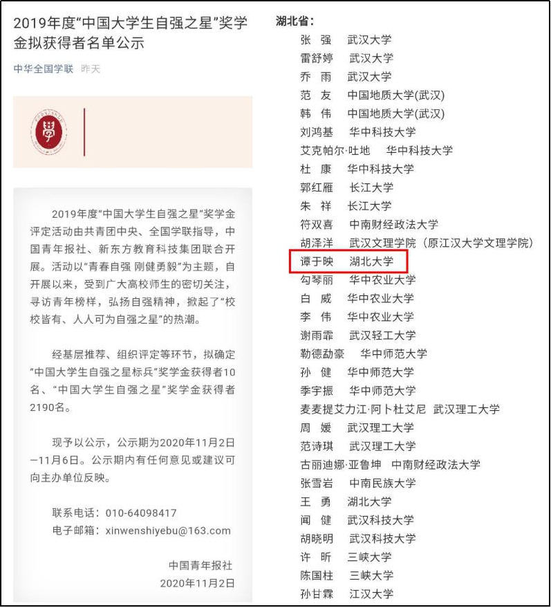 近日,由共青团中央、全国学联指导,中国青年报社、新东方教育科技集团联合开展的以“青春自强 刚健勇毅”为主题的2019年度“中国大学生自强之星”奖学金评定名单出炉。我院2017级软件工程专业谭于映同学作为榜样引领自强典型脱颖而出,成为2190名“中国大学生自强之星”奖学金获得者中的一员。同时,她还是湖北省2019年度“大学生自强之星”标兵,也是我校第一次获评是湖北省自强之星标兵。