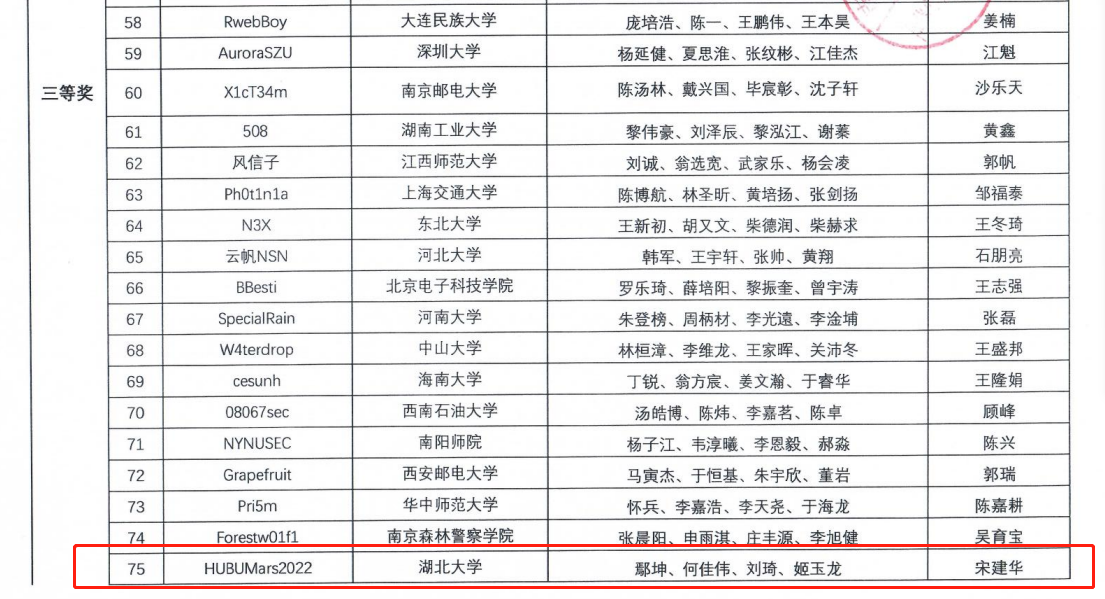 我校HUBUMars2022团队由我院宋建华老师指导,团队成员由我院学生鄢坤、何佳伟、刘琦,数学与统计学院研究生姬玉龙组成。“不经一番寒彻骨,怎得梅花扑鼻香”。团队成员鄢坤表示:“这次比赛取得的成绩离不开宋老师的谆谆教导,也离不开团队成员一次次训练赛的磨合、复盘,沉下心来磨练技术,静下心来积累经验,才能在网络安全的道路上行路致远!”