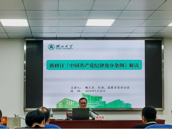 为深入开展党纪学习教育,5月10日晚,学院邀请校纪委监察专员办公室主任魏文杰来院作党纪学习教育专题辅导报告,系统解读新修订《中国共产党纪律处分条例》。学院党委委员,基层党支部书记、支部委员和分党校全体入党积极分子学员参加学习。