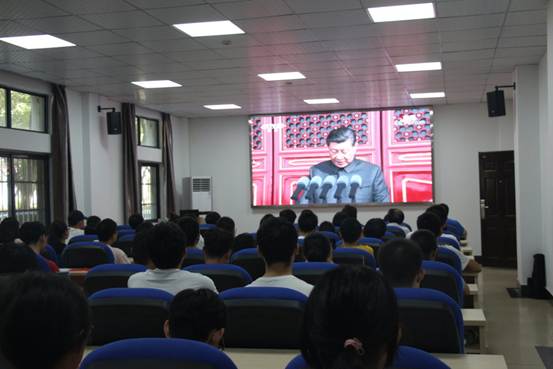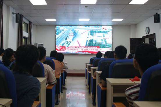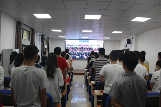 10点整,阅兵仪式正式开始,我院观看直播的师生紧跟观礼现场流程,全体起立、行注目礼,伴随着视频中的伴奏《义勇军进行曲》,全场高唱中华人民共和国国歌,目送五星红旗冉冉升起,现场氛围庄严肃穆。