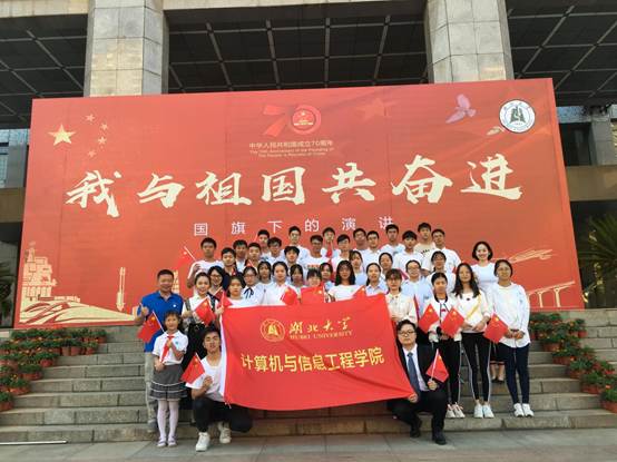 为庆祝新中国成立70周年,我院师生代表于10月1日在思睿广场(综合楼门前)参加学校组织的升国旗活动。6点30分,学院书记潘永才、副书记熊琳及师生代表四十人身着正装,佩戴校徽,一起等待迎接庄重的升旗仪式。