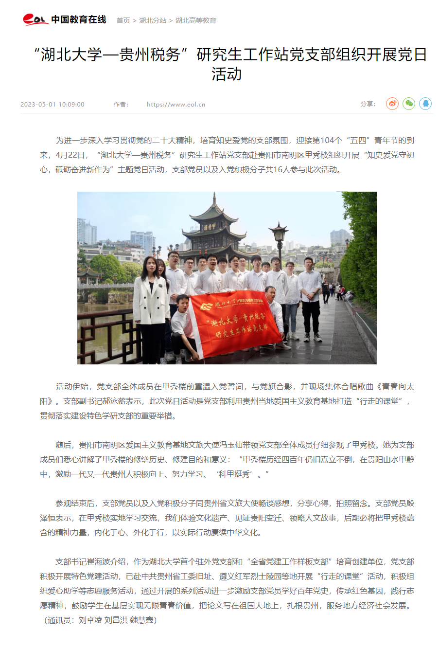 为进一步深入学习贯彻党的二十大精神,培育知史爱党的支部氛围,迎接第104个“五四”青年节的到来,4月22日,“太阳集团古天乐—贵州税务”研究生工作站党支部赴贵阳市南明区甲秀楼组织开展“知史爱党守初心,砥砺奋进新作为”主题党日活动,支部党员以及入党积极分子共16人参与此次活动。