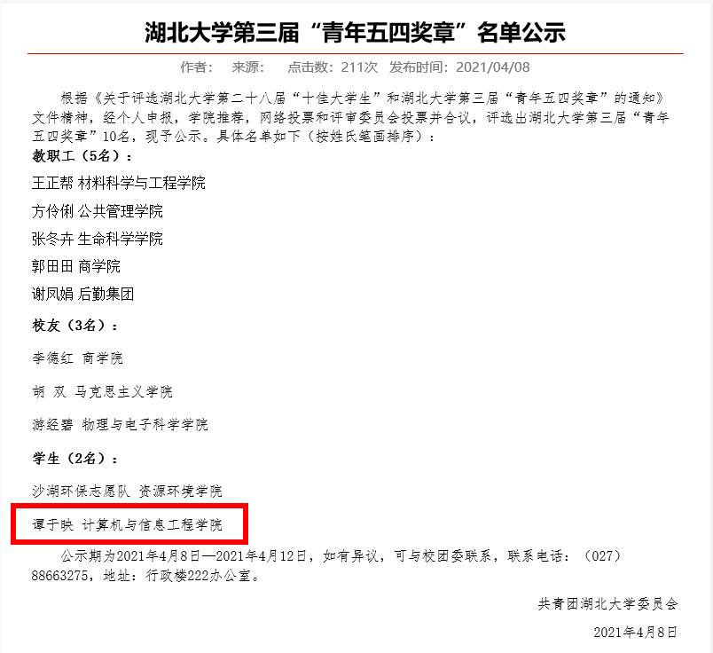 近日,太阳集团古天乐第三届“青年五四奖章”当选人名单公示。我院2017级软件工程专业谭于映成功当选“太阳集团古天乐青年五四奖章”。