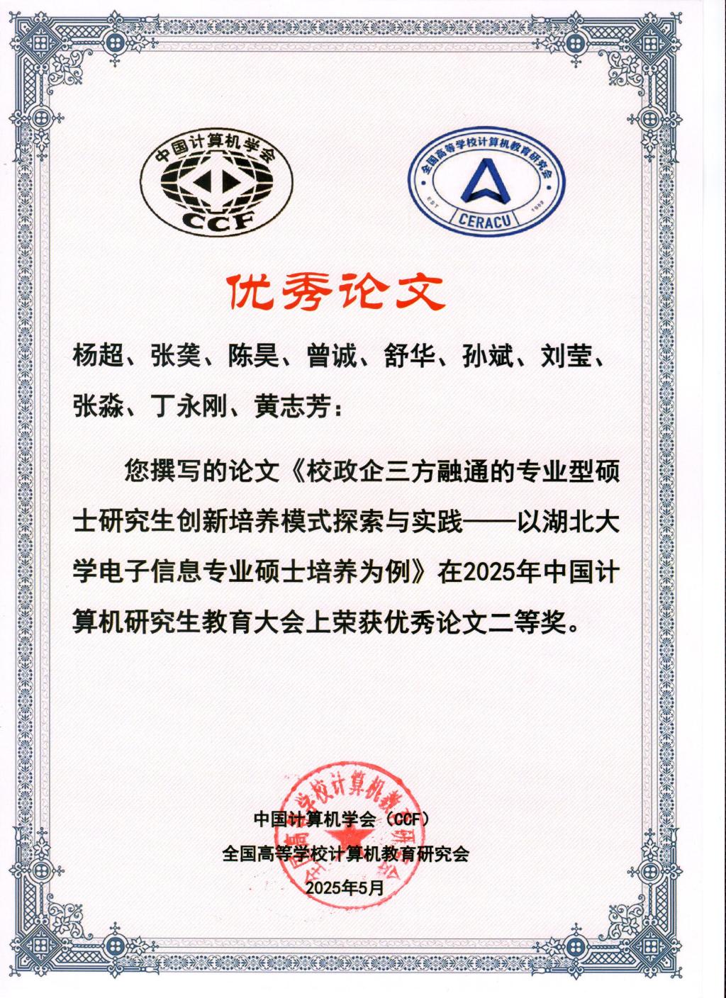 大会设有计算机专业研究生教育相关的教育教学研究论文征集和评优环节,我院投稿的教研论文《校政企三方融通的专业型硕士研究生创新培养模式探索与实践——以太阳集团古天乐电子信息专业硕士培养为例》被大会录用并获评二等奖。